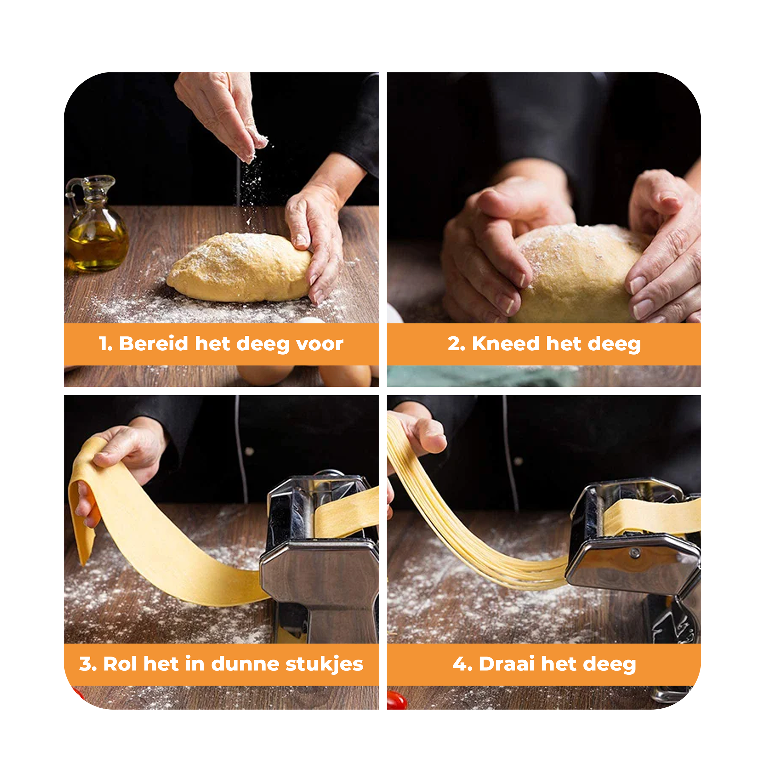 Met onze pastamachine maak je in een paar eenvoudige stappen heerlijke, verse pasta in je eigen keuken. Volg de onderstaande stappen en geniet van de perfecte pasta binnen enkele minuten!