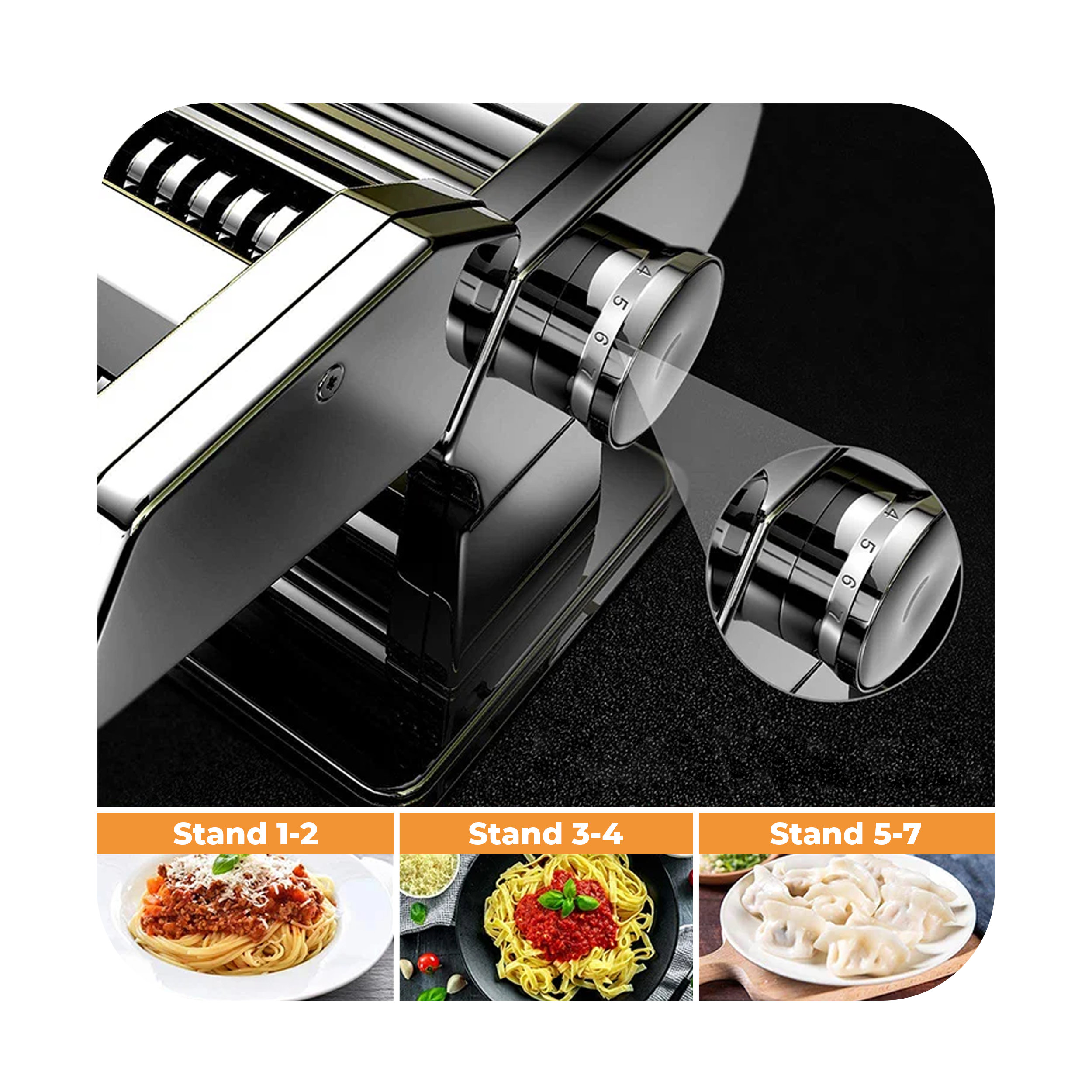 Onze pastamachine wordt geleverd met verschillende opzetstukken, zodat je verschillende soorten pasta kunt maken zoals spaghetti, tagliatelle, en lasagnebladen. Selecteer het opzetstuk voor jouw favoriete pastavorm.